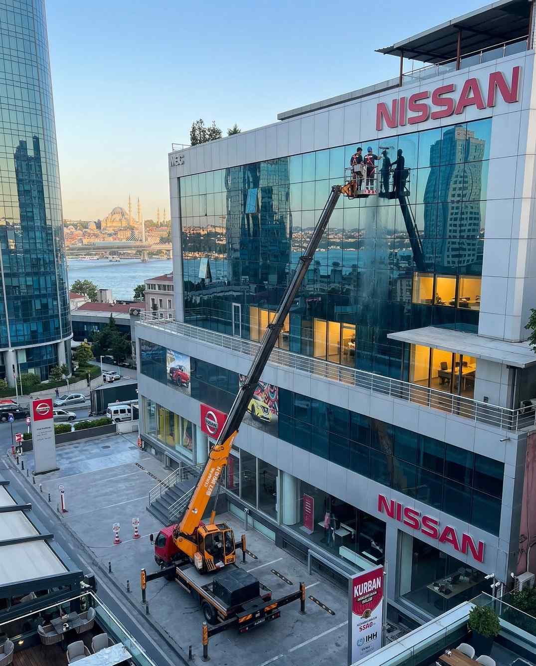 Yoğun trafikli bölgede dış cephe temizlik çalışmaları
